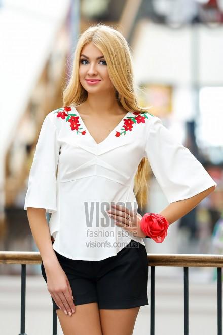 Полуприлегающая блуза А-образного силуэта. Ярким центром композиции является вышивка цветочная ветка, которая красиво спадает с плеча по горловине. Имеется подрез под грудью, на лифе выполнены декоративные вытачки-склады. Спинка оформлена гипюровой вставкой. Боковой шов переходит на перед оформляя фигурный низ блузы. Рукав полуприлегающий расклешенный к низу.