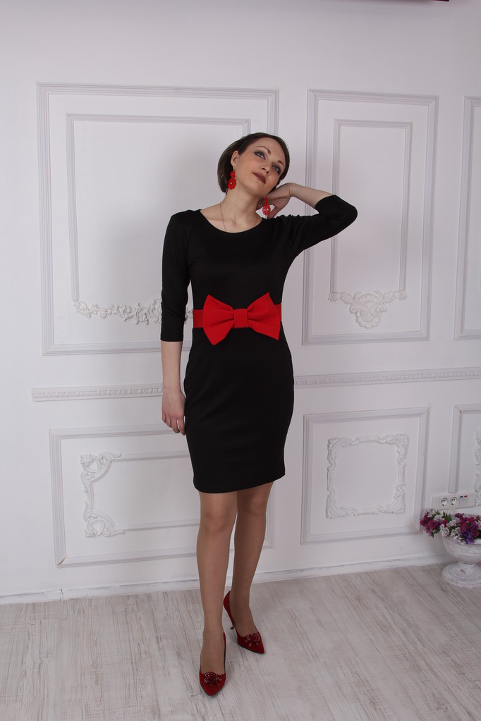 Черное платье с красным бантом.